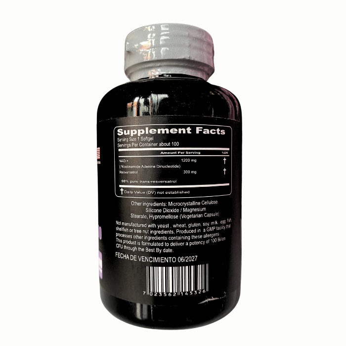 NAD+ y Resveratrol, conocidos por su capacidad para apoyar la salud celular, el metabolismo y el envejecimiento saludable. Presentacion x 100 capsulas.